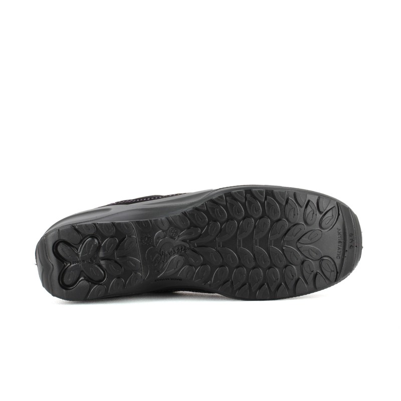 Cette chaussure de securite S3 pour femme est en cuir velours noir WRU épaisseur 1,8 à 2,0 mn. La doublure est en tissu respirant et résistant à l'abrasion. Ce modèle de chaussure sécurité est amagnétique, cela signifie qu'il est sans parties métalliques avec languette souple, doublée et matelassée. Cette chaussure de sécurité pour femme est équipée d'un embout 200J polymérique composite non-thermique EN 12568. La semelle intercalaire et en composite de tissu flexible anti perforation EN 12568. Pour votre confort, la chaussure de sécurité pour femme est fabriquée avec une SEMELLE BLOOM en polyuréthane double densité antistatique, résistante à l'hydrolyse ISO 5423:92, aux hydrocarbures et à l'abrasion, avec un talon anti-choc et antidérapante SRC. De plus, la semelle intérieure bis composants est amovible : absorbante, antistatique, respirante et antidérapante avec zone du talon anatomique et anti choc. ESD CLASSE 3 passe le test EN ISO 61340-4-3,selon la norme EN ISO 61340-5-1 pour la résistance électrique