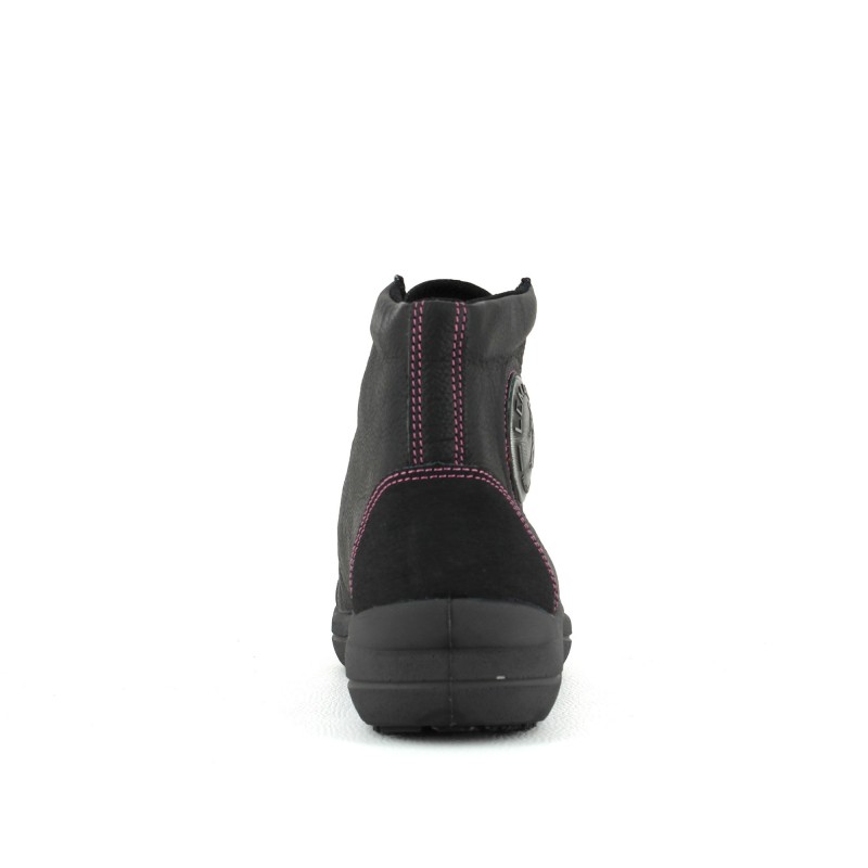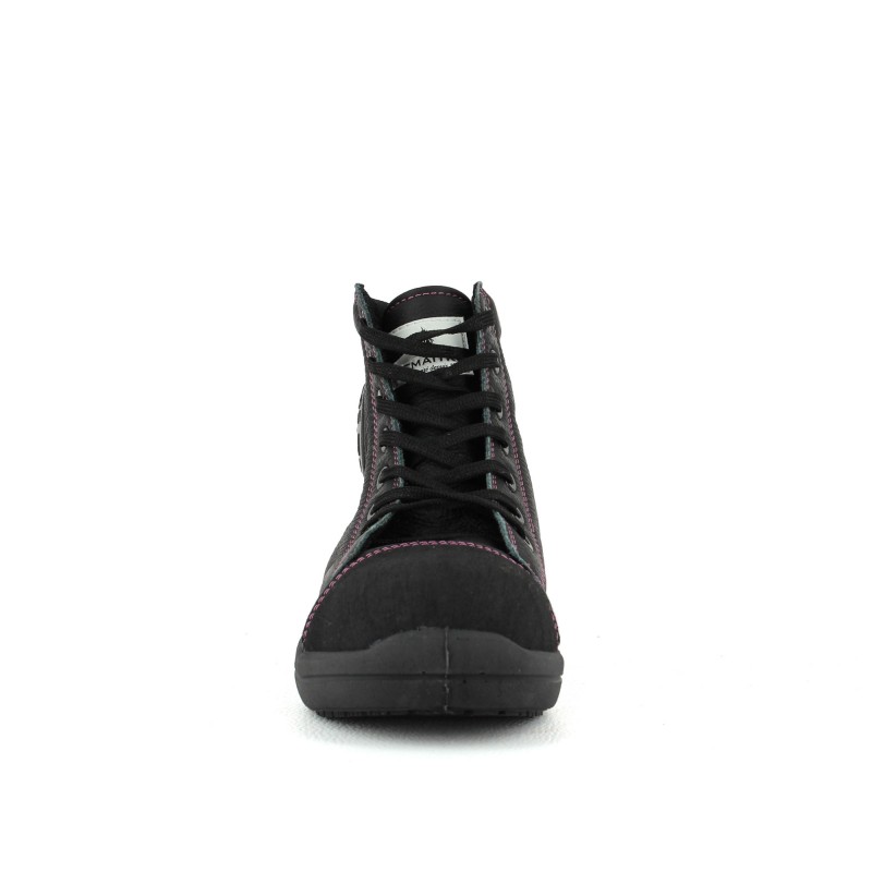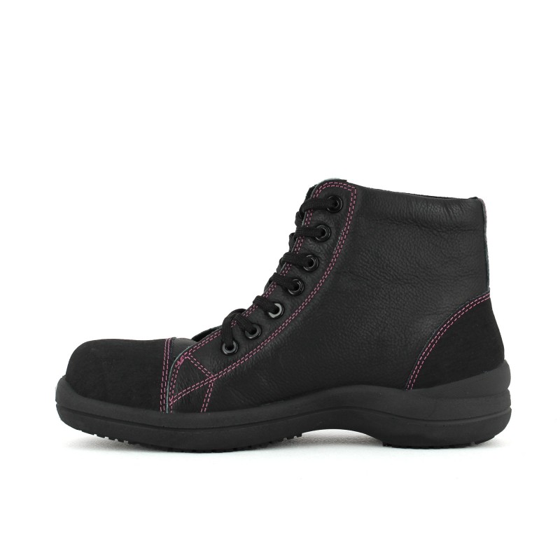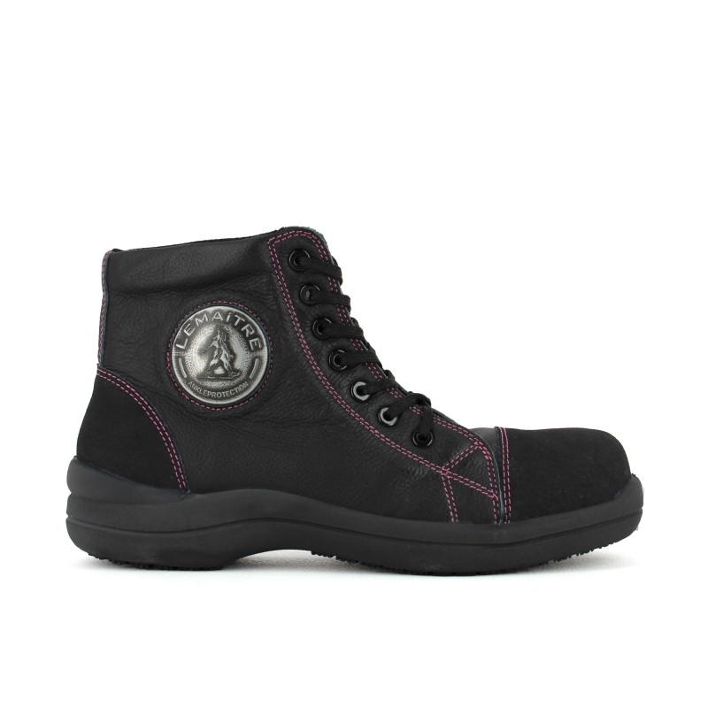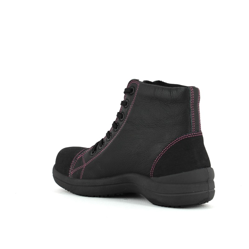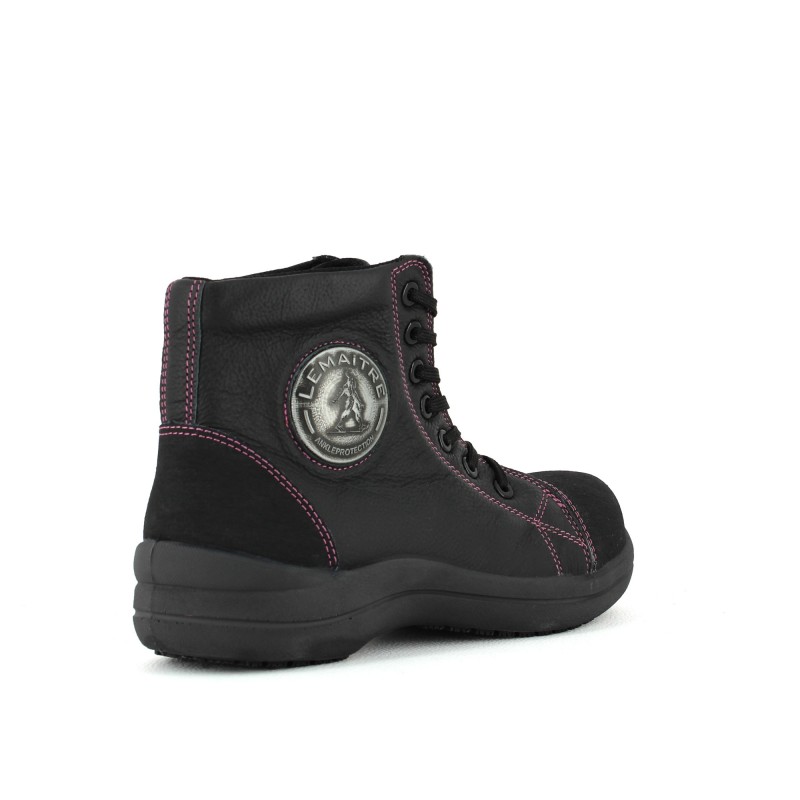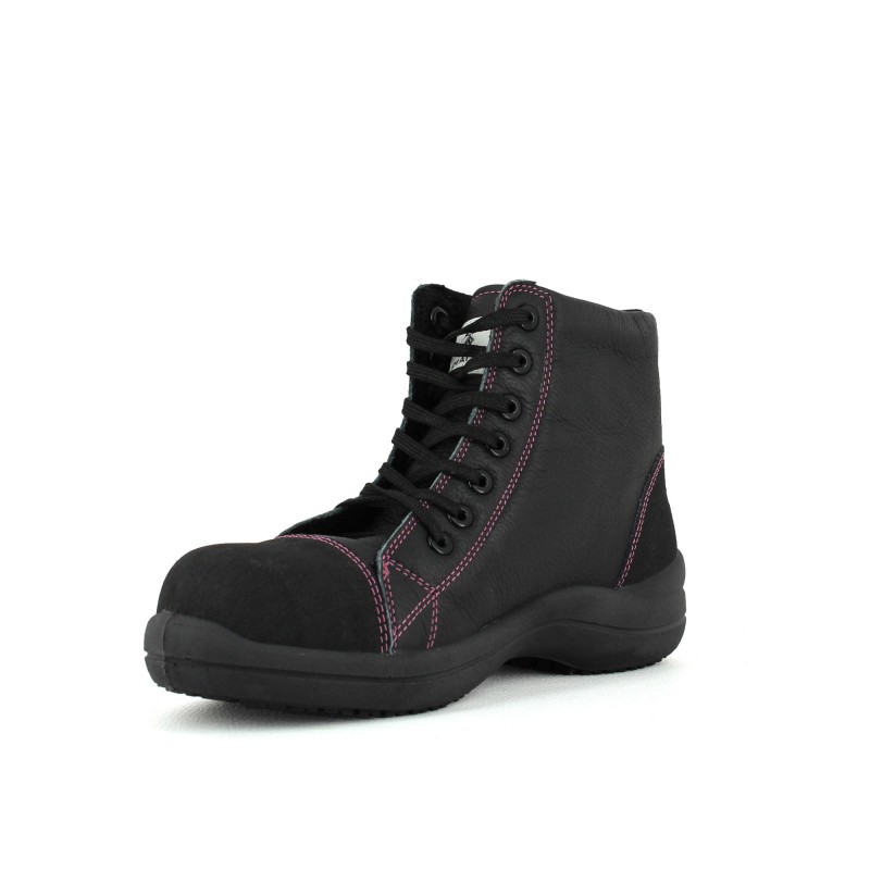 Chaussure de sécurité légère montante pour femme en cuir souple pleine fleur grainé hydrofuge noir avec des coutures de couleur rose. Cette chaussure de sécurité légère dispose de diverses qualités :