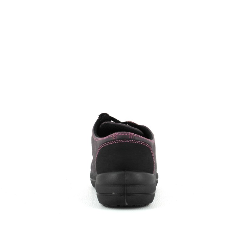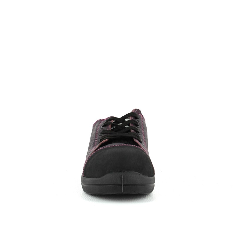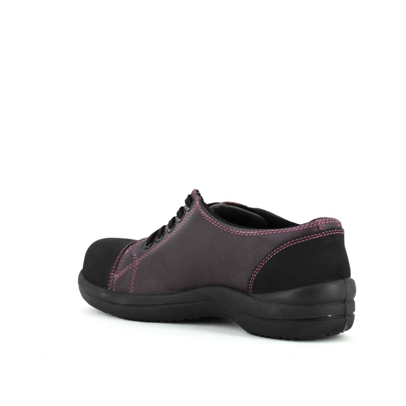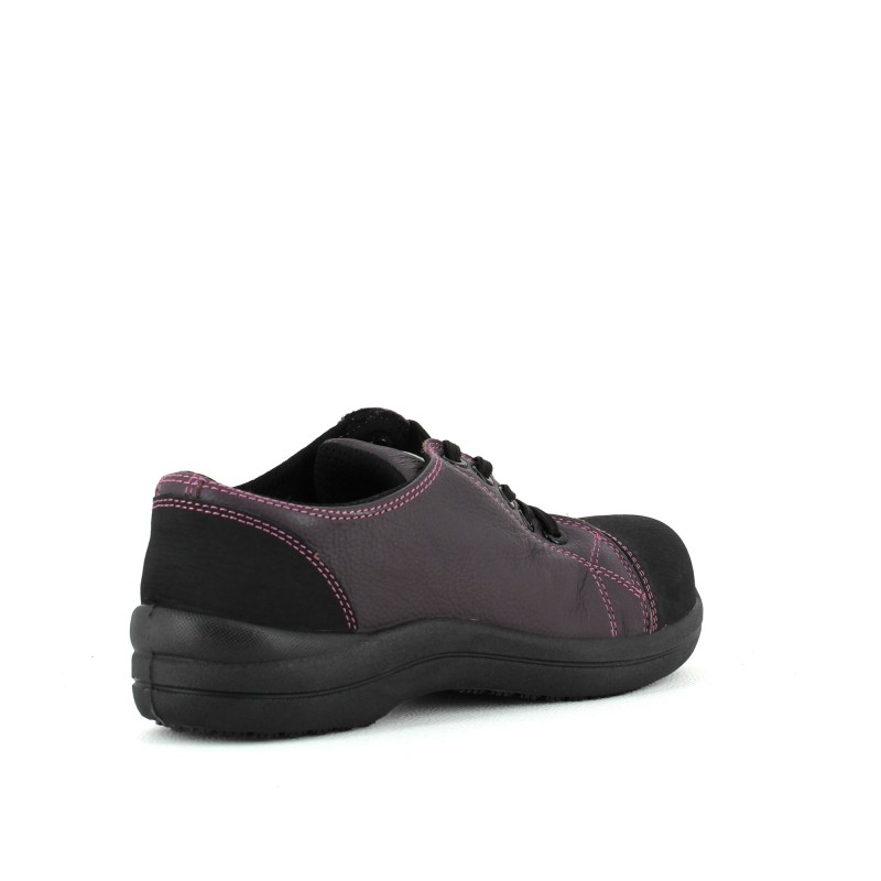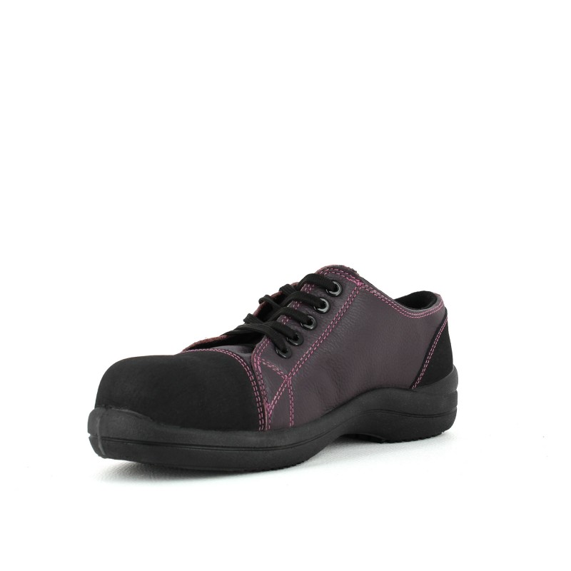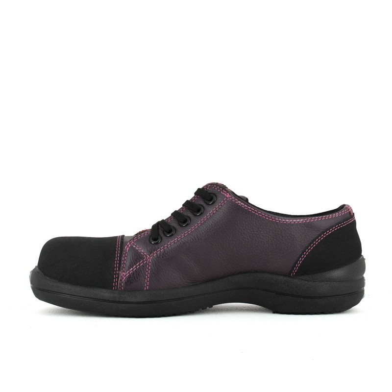 Chaussure de sécurité basket pour femme en cuir souple pleine fleur grainé hydrofuge prune. Cette tennis de sécurité légère dispose de diverses qualités :