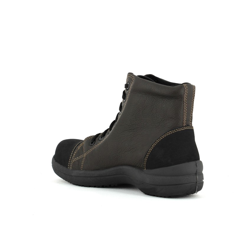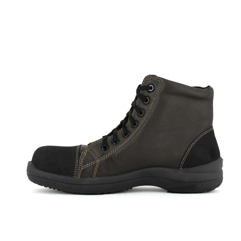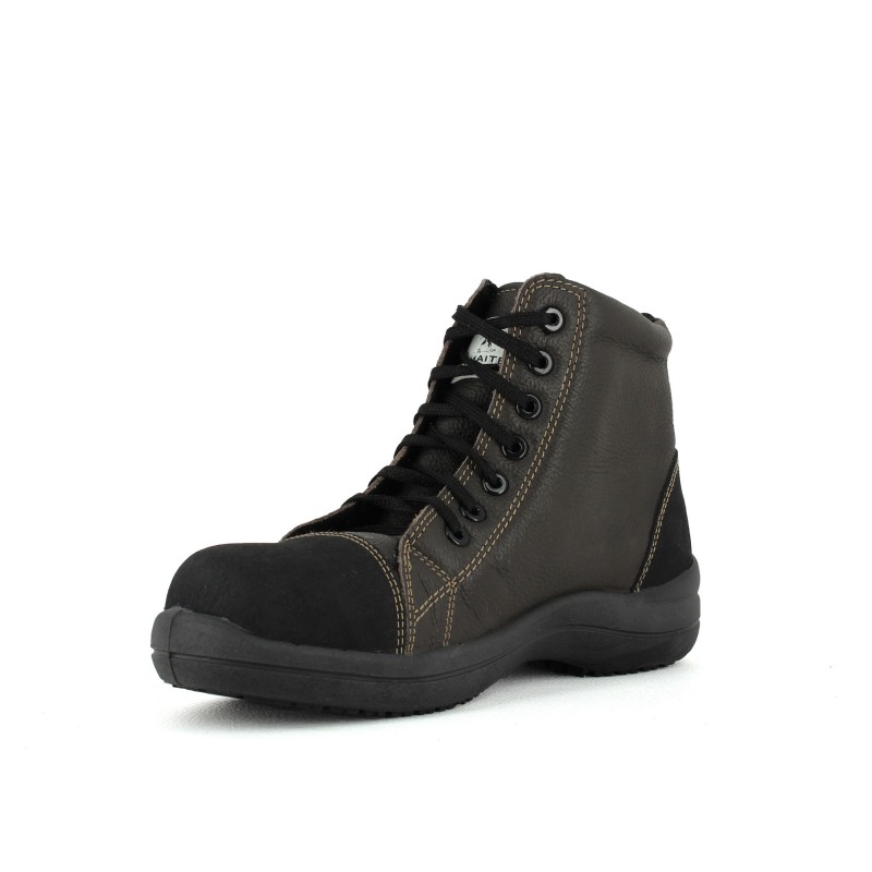 Chaussure de sécurité légère montante pour femme en cuir souple pleine fleur grainé hydrofuge chocolat avec des coutures de couleur contrastée. Cette chaussure de sécurité légère dispose de diverses qualités :