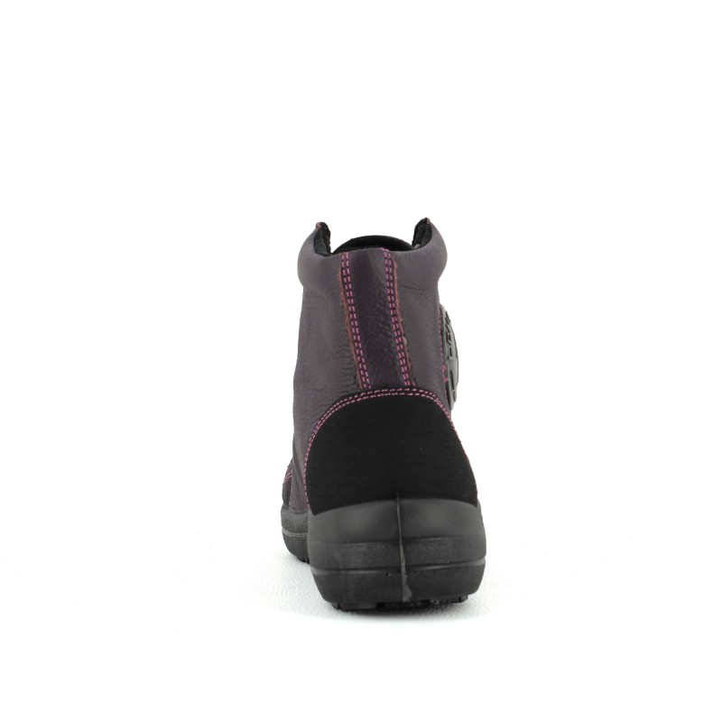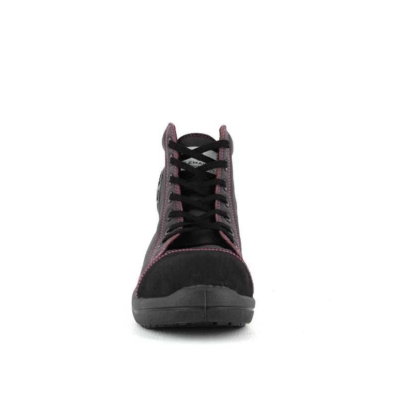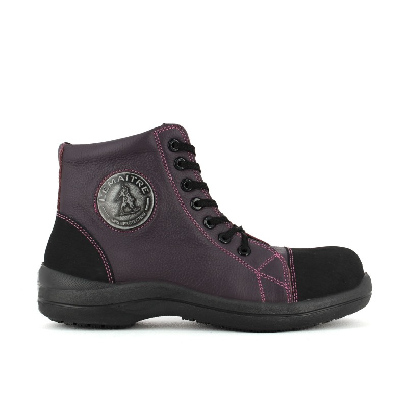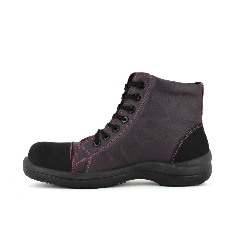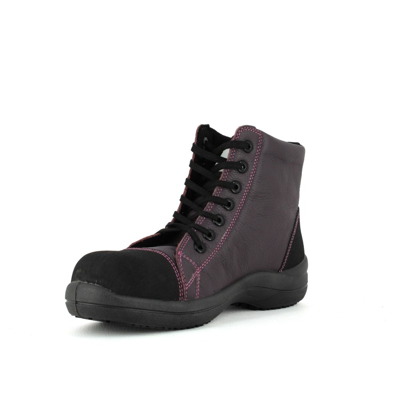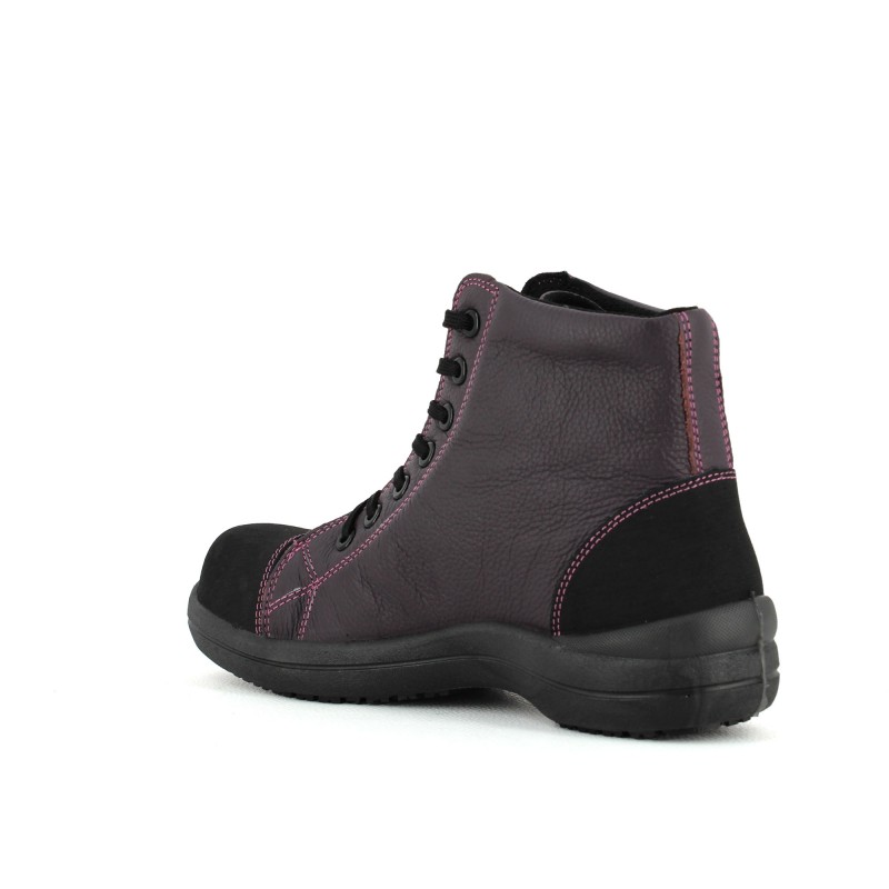Chaussure basket de sécurité légère haute femme en cuir souple pleine fleur grainé hydrofuge prune avec des coutures de couleur contrastée. Cette basket de sécurité légère dispose de diverses qualités :