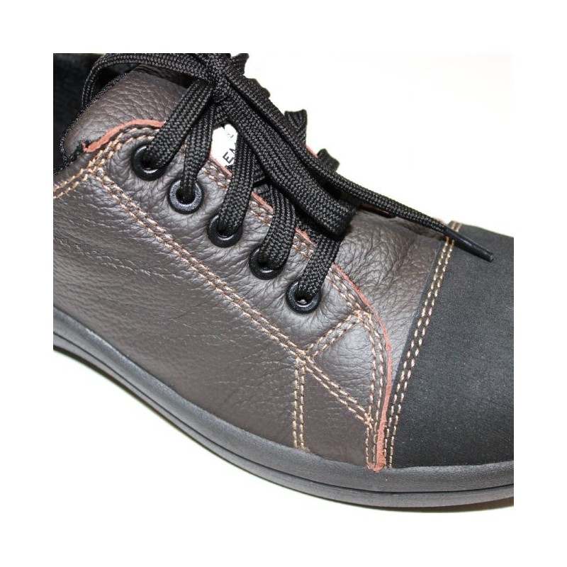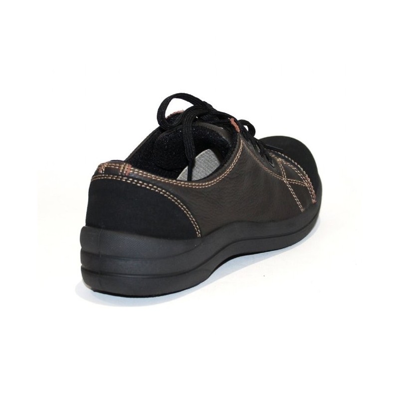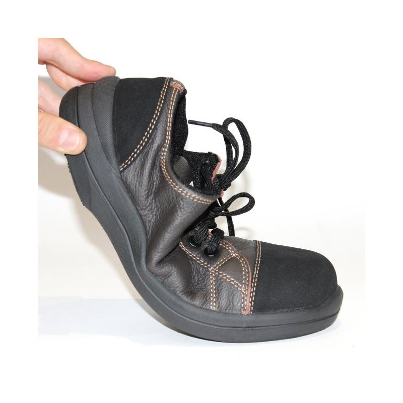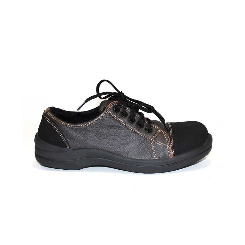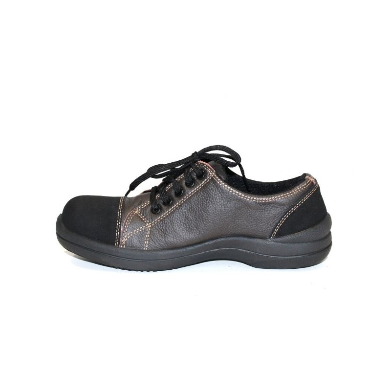 Chaussure de sécurité basket pour femme en cuir souple pleine fleur grainé hydrofuge chocolat avec des coutures de couleur contrastée. Cette basket de sécurité légère dispose de diverses qualités :