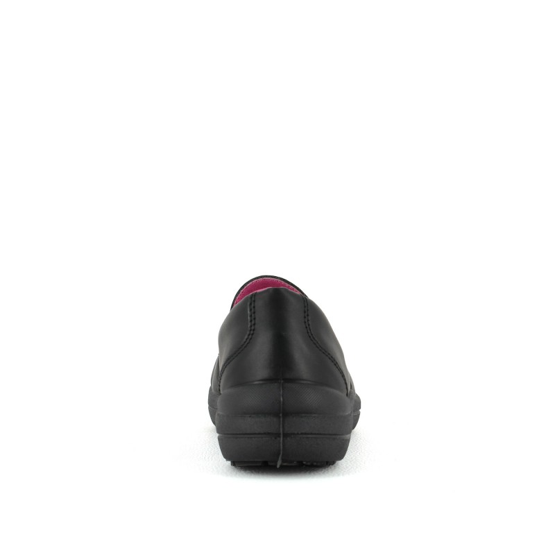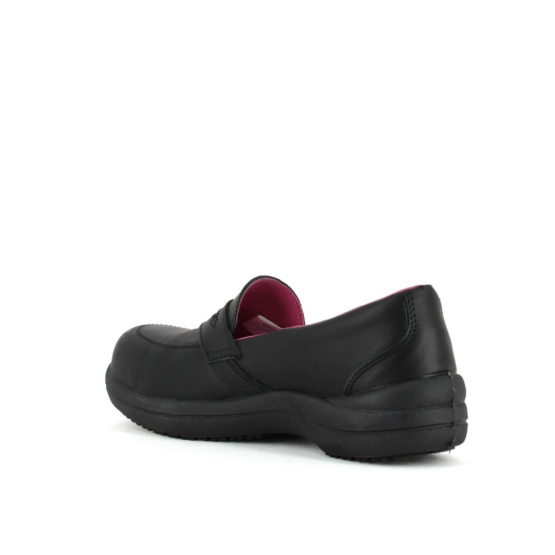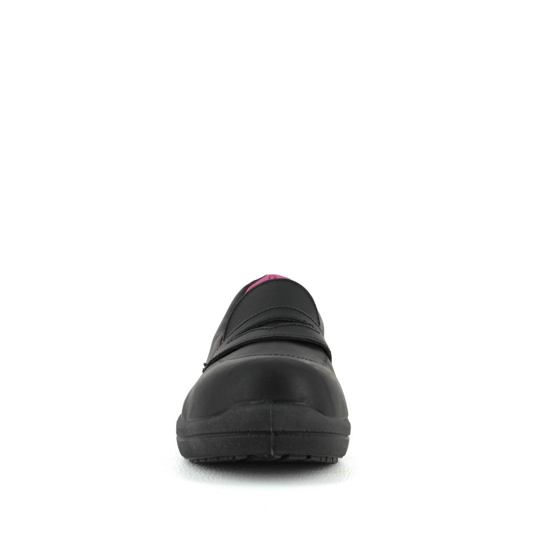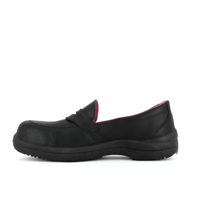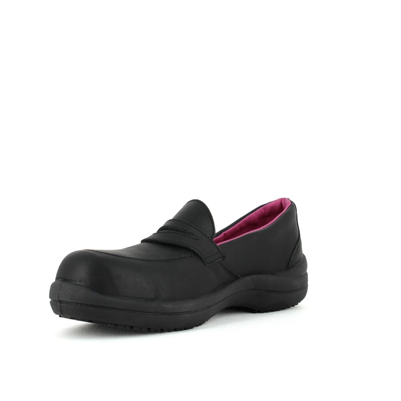 Cette chaussure de sécurité mocassin léger S3 pour femme est en cuir pleine fleur hydrofuge noir, avec une doublure microfibre respirante. Elle présente divers atouts :