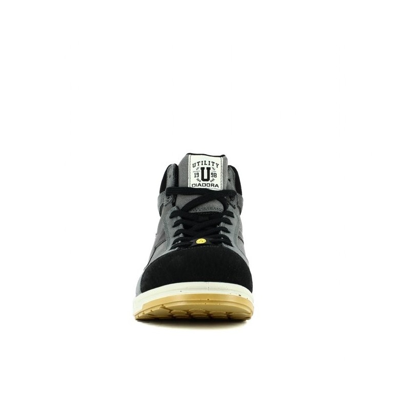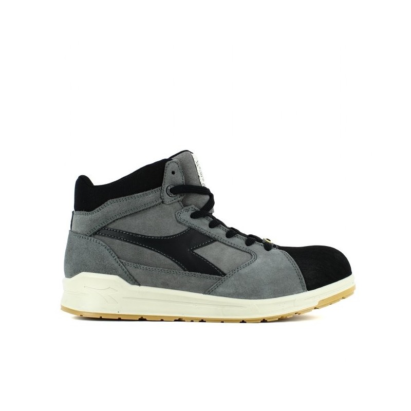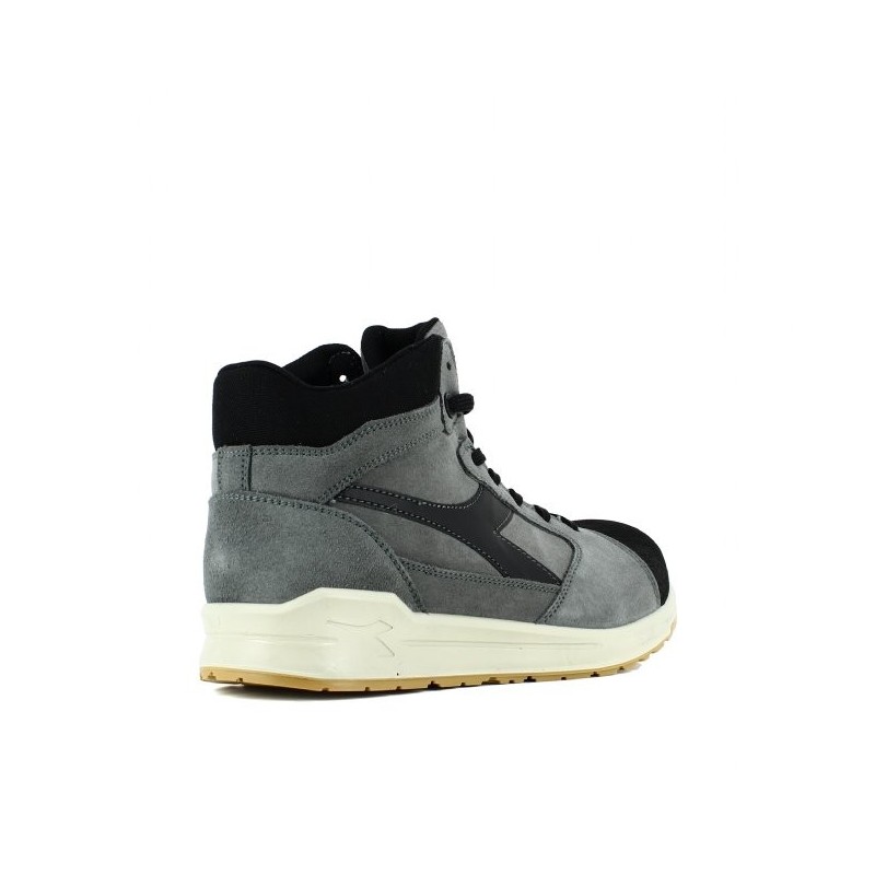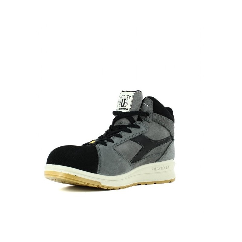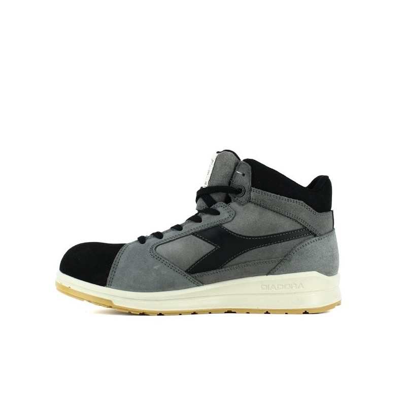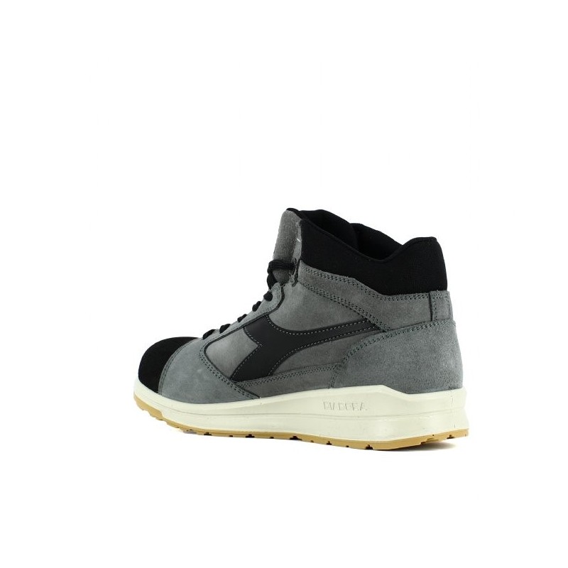 Chaussure de sécurité Diadora grise et noire montante avec embout anti rayures. C'est un excellent modèle de chaussure de sécurité, disposant d'un embout en acier de 200 Joules.